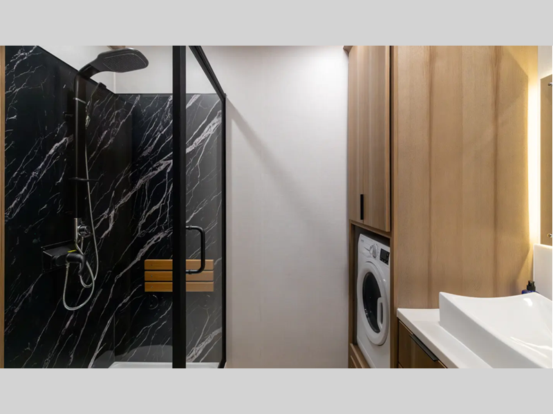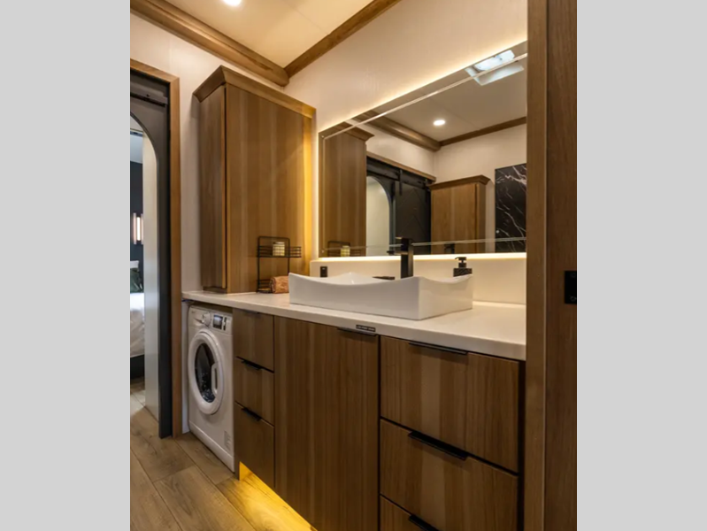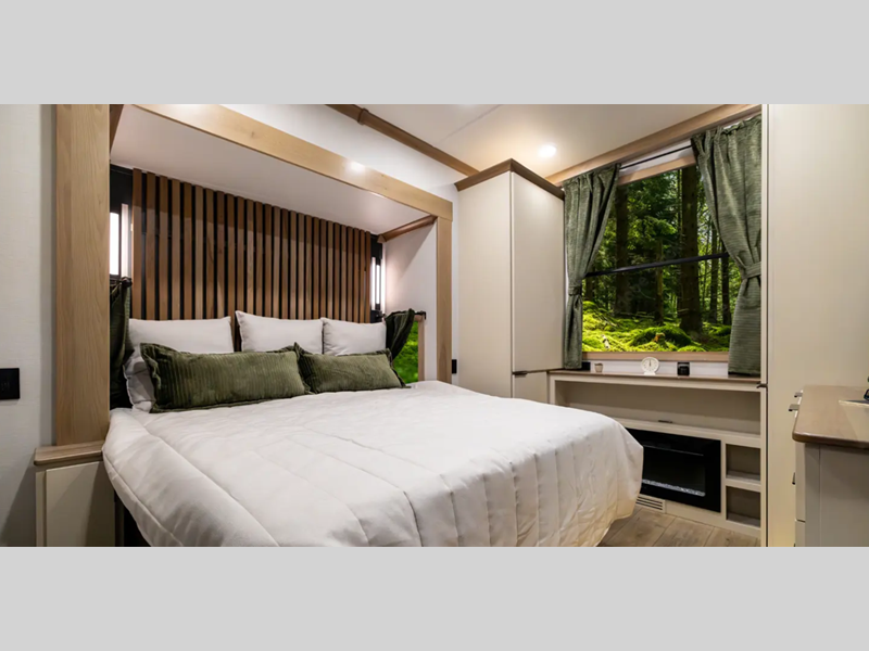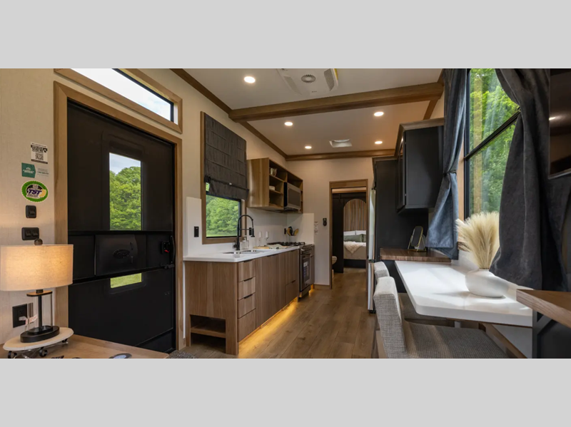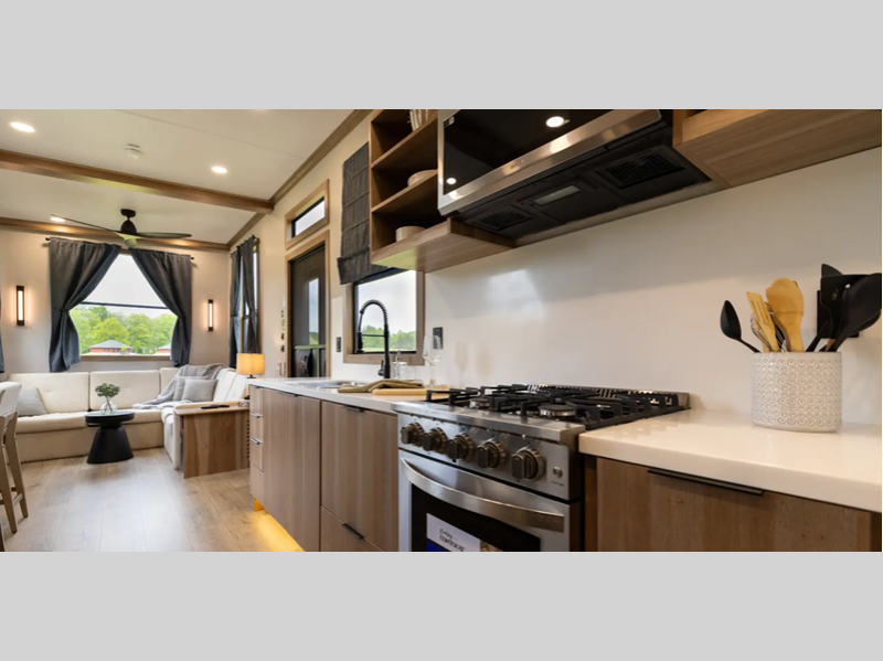 Each destination trailer is built with Azdel Onboard composite sidewall panels for superior insulation, lighter weight, and lasting durability. There are also dual pane windows, a durable rolled fiberglass roof, and stylish full-body paint. The hardwood cabinetry inside is sure to make you feel at home, along with luxury vinyl flooring, a 10" thick memory foam mattress, and residential appliances.