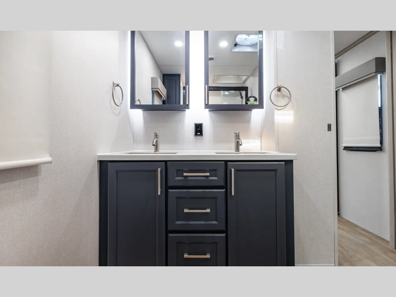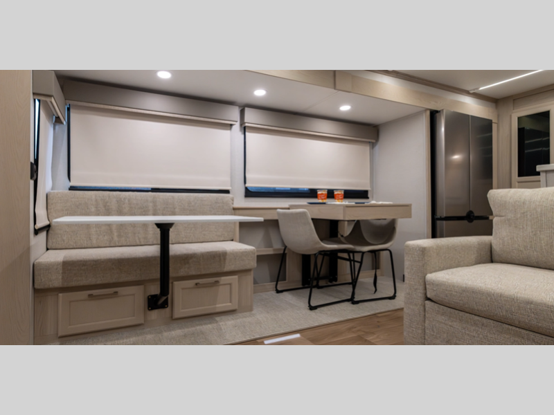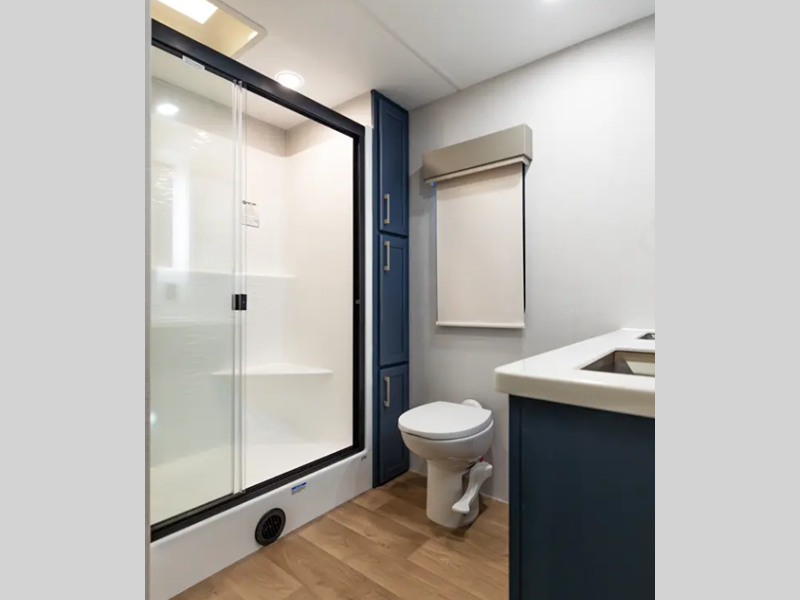 There is a 6-point hydraulic leveling system that will have you set up at camp in no-time, and the slam latches on all storage doors will make it easy to unload your gear. A heated utility convenience center is also found outside, along with a tire pressure monitoring system, a ladder, and slide toppers. Inside, you'll be met with upgraded true solid surface countertops in the bath and kitchen, dimmable ceiling strip lighting, hybrid marine-grade carpet, plus roller day/night shades in the main areas to name a few comforts.