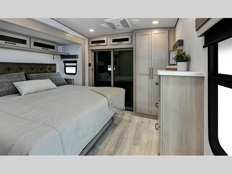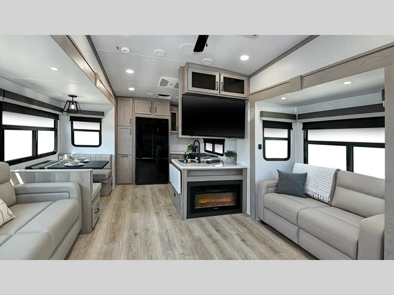Sleeps 4 Slides 2 Length 34 ft Ext Width 8 ft Ext Height 13 ft 4 in Hitch Weight 1717 lbs Dry Weight 9884 lbs Cargo Capacity 2233 lbs Fresh Water Capacity 54 gals Grey Water Capacity 92 gals Black Water Capacity 53 gals Tire Size 16" Furnace BTU 35000 btu Available Beds Queen Refrigerator Type 12V Cooktop Burners 3 Number of Awnings 2 LP Tank Capacity 30 lbs Water Heater Capacity 12 gal Water Heater Type Quick Recovery Auto Ignition Gas/Electric AC BTU 30000 btu TV Info LR Smart TV Awning Info 10' and 15' Power with Adjustable Rain Dump and LED Light Strip Axle Count 2 Number of LP Tanks 2 Shower Type Standard Electrical Service 50 amp Solar Wattage 200 watts Similar Floorplans