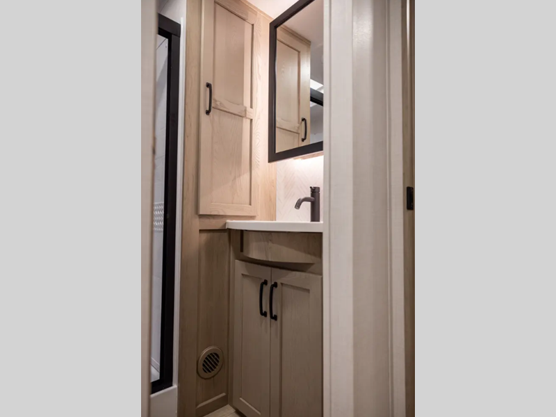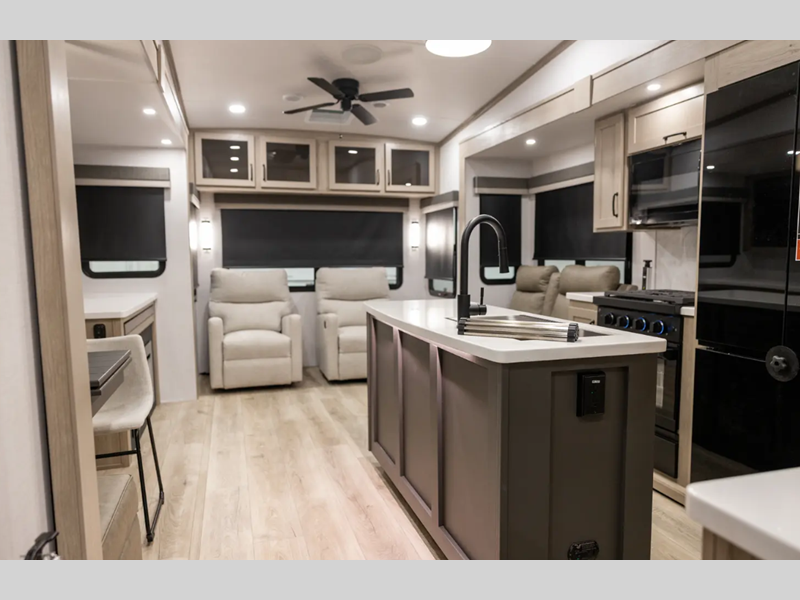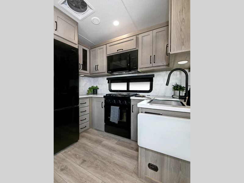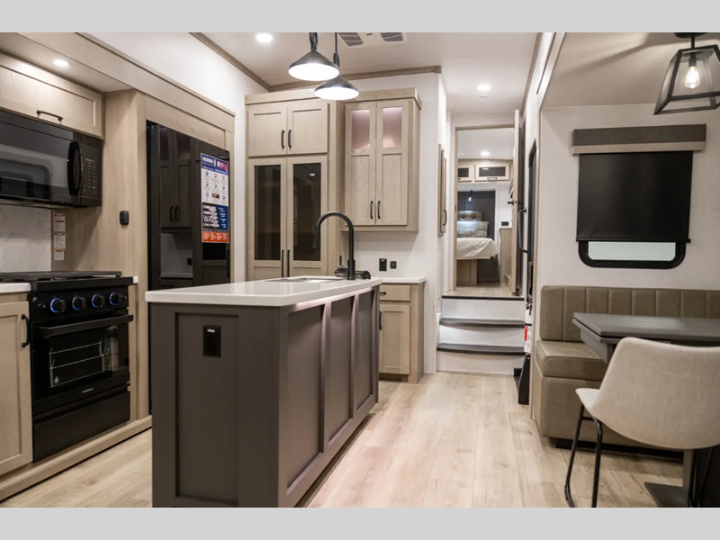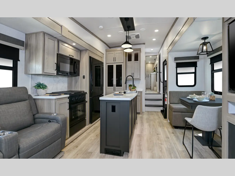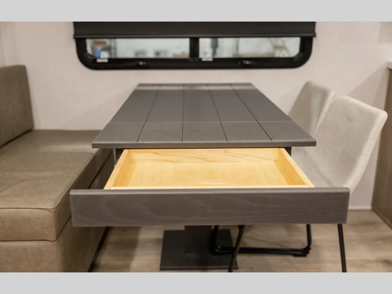 Outside, you'll find a power awning with an adjustable rain dump and LED lighting, backup camera pre, Keyed Alike locks, plus many more conveniences. The enclosed underbelly will help extend your camping season, and you can enjoy your RV for years thanks to the durable construction materials, like the radiant foil insulation and 5/8" plywood tongue and groove subfloor. Each fifth wheel and travel trailer also includes lino flooring in all slides, aluminum dinette, bed and bunk, plus solid surface kitchen countertops.