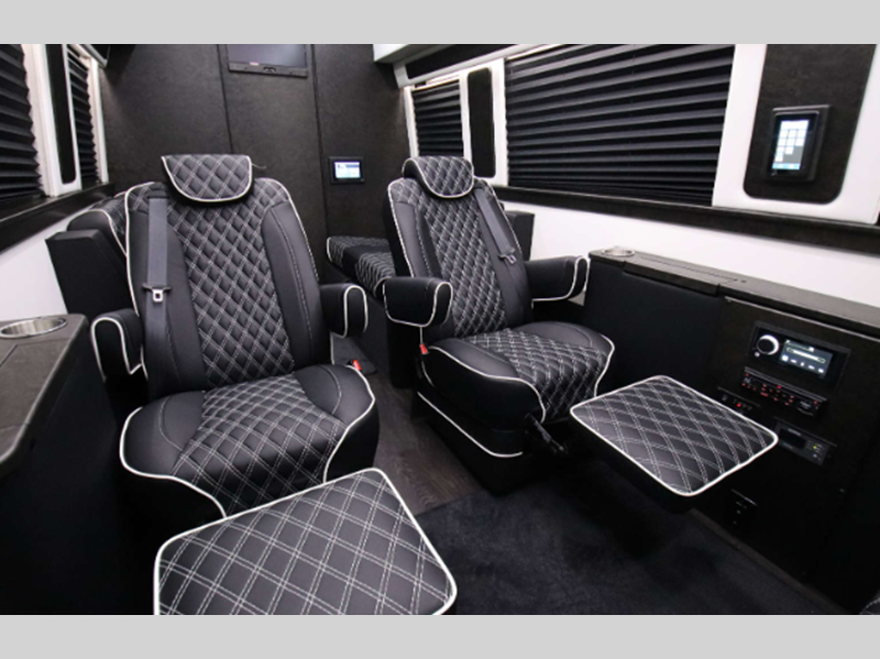 Each coach sits on a durable Mercedes-Benz Sprinter chassis with a 2.0L Inline-4 high-output diesel engine to power your excursions. Inside, you'll be met with luxury custom seating, composite wood grain flooring, satin wood finish, and many more elegant features to make you feel at home.