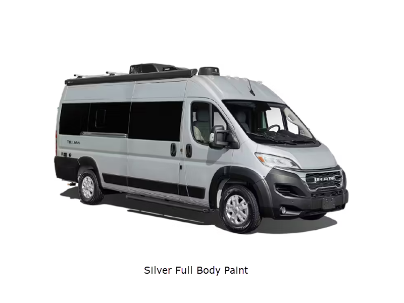 Sleeps 2 Length 21 ft 1 in Ext Width 6 ft 9 in Ext Height 9 ft 5 in Int Height 6 ft 3 in Interior Color Modern White Exterior Color Full Body Paint; Silver, White. Ceramic Gray Hitch Weight 5000 lbs GVWR 9350 lbs Fresh Water Capacity 27 gals Grey Water Capacity 20 gals Black Water Capacity 4.75 gals Furnace BTU 14300 btu Generator 2800 Gas Fuel Type Gasoline Engine 3.6L Pentastar V6 Chassis RAM ProMaster 3500 XT Horsepower 276 hp Fuel Capacity 24 gals Wheelbase 159 in Available Beds Two Twin Torque 250 ft-lb Refrigerator Type Double Door Cooktop Burners 1 Number of Awnings 1 LP Tank Capacity 24.78 lbs. Water Heater Capacity 2.64 gal Water Heater Type Combi Eco LP AC BTU 11000 btu TV Info LR 24" Smart TV Awning Info 12' Thule Lateral Arm Power with Integrated LED Lighting Gross Combined Weight 11500 lbs Shower Type Wet/Bath Shower Electrical Service 30 amp Solar Wattage 200 watts Similar Floorplans